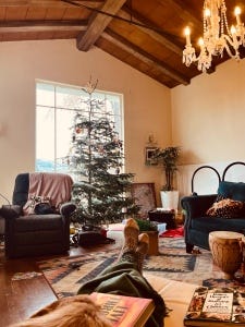 There is a dog in my lap and a cat lurking nearby. My feet are up, the sky is grey, anticipating the rare gift of rain coming. The big tree out front has almost no leaves left, and the Christmas tree in the foreground is shedding needles everywhere.